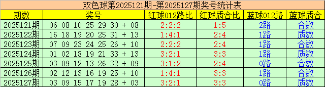 开奖回归:福彩双色球第2025127期红球为:03 09 15 17 19 28,蓝球为:03,红球012路比为3:2:1,和值为91,跨度为25,质合比为3:3,蓝球为0路、质数号码。