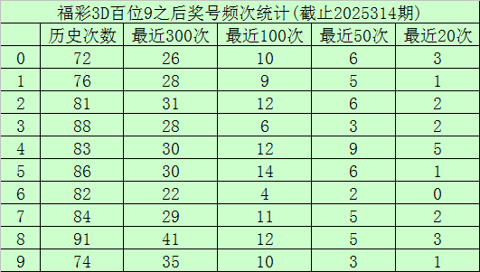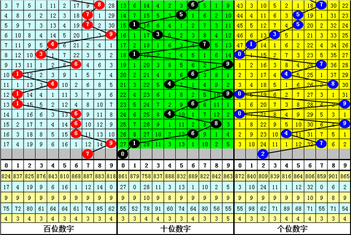 百位杀号:上期百位开出号码9,历史上百位号码9已开出818次了,最近100次百位号码9出现之后,其下期各号码频次分辨为:号码5出现14次,2、4、8出现12次,7出现11次,0、9出现10次,1出现9次,3出现6次,6出现4次。