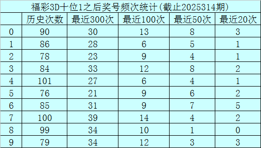 十位杀号:上期十位奖号为1,历史上十位奖号1共出现879期,前100次十位开出奖号1时,其下期0-9奖号频次分辨为:奖号7开出14次,0开出13次,3、9开出12次,8开出10次,2、5、6开出9次,1、4开出6次。